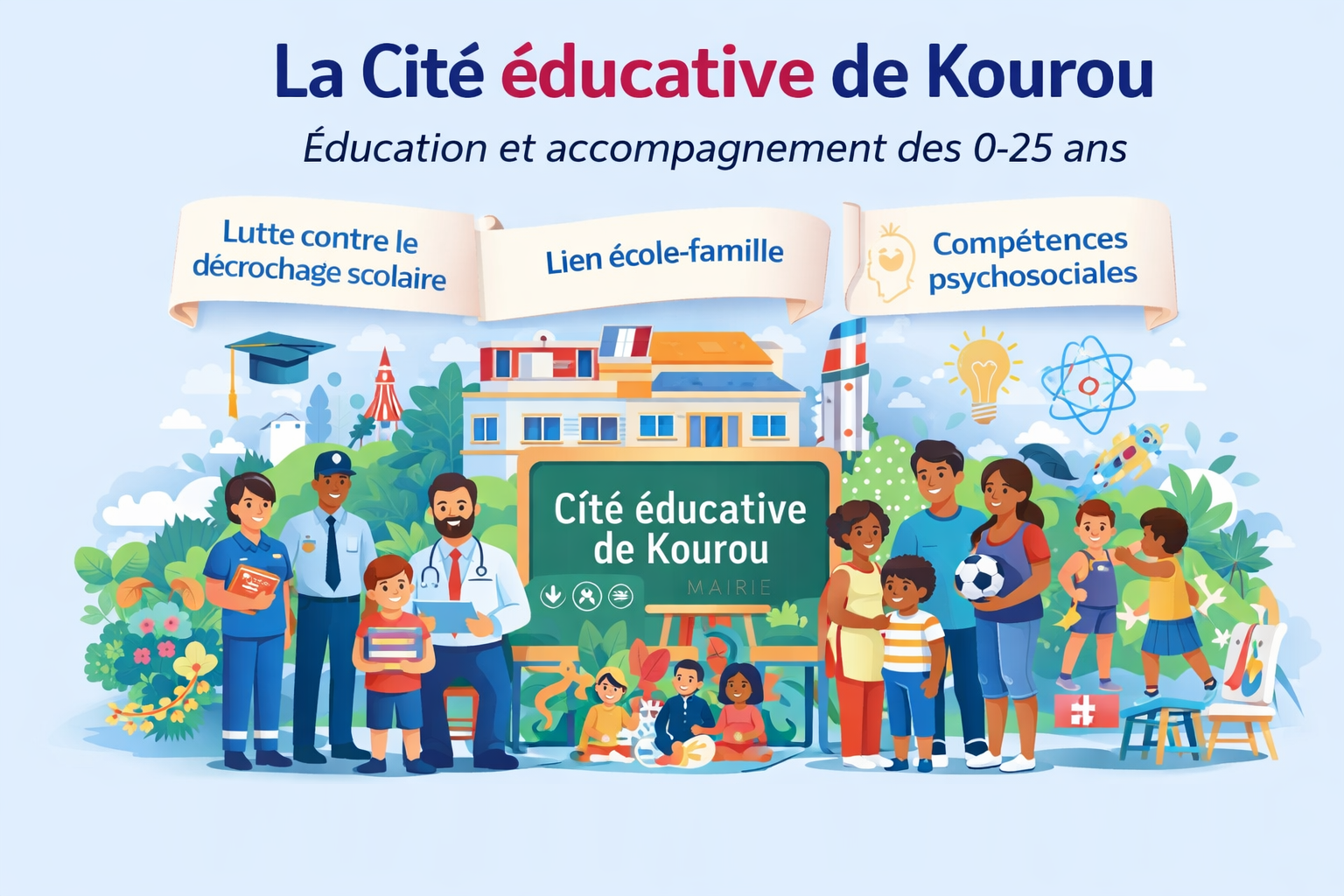 Labellisée Cité éducative depuis 2022, la Ville de Kourou s’inscrit dans un dispositif national de la politique de la ville, co-piloté par l’État, le Rectorat et la commune. Cette démarche vise à renforcer l’accompagnement éducatif des enfants et des jeunes de 0 à 25 ans, sur l’ensemble de leurs temps de vie.